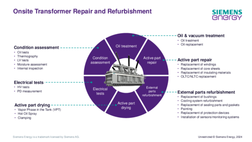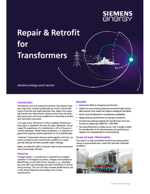 Depending on the initial situation, it may be expedient from an economic standpoint to have an older or damaged transformer overhauled at one of our Siemens Energy production locations. Based on our experience, an overhaul restores transformer availability for an extended time with no restrictions in operating reliability. There are advantages over the production of a new transformer. An overhaul and restoration are usually significantly more cost-effective and time-efficient. Our customers also experience significantly shorter outage times.