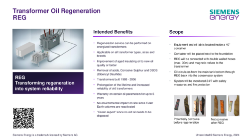 If the insulating oil contains a high fraction of degradation products and acids, it can be completely regenerated using the SITRAM REG system. The regeneration process cleans the oil and restores it to the quality level of new oil. The regeneration process is highly cost-effective, as it is especially time-saving and does not require the transformer to be shut down.