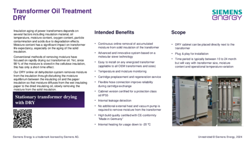 If the moisture content of the insulating oil is too high, the use of DRY is recommended. This system effectively removes moisture from both the insulating oil and from solid insulating materials such as paper, pressboard and plywood. This increases the dielectric strength of the current-carrying components and counteracts the aging process of the insulating materials.