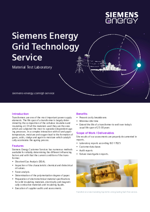 An important factor for ensuring availability is the condition of the insulating oil. The condition of this oil determines the extent to which safe, continuous operation of the transformer is possible. Moisture, degradation products and acids in the oil jeopardize safe operation and also shorten service life. It is therefore important to regularly check the condition of the oil and to take appropriate action in the event of a decrease in oil quality.