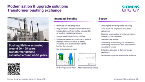 The program offers a full-service bushing replacement for 110kV to 800kV systems, reducing failure risk and extending asset life. Services include evaluation, engineering checks, customized installation design, delivery, and installation of new bushings, and removal of old ones.